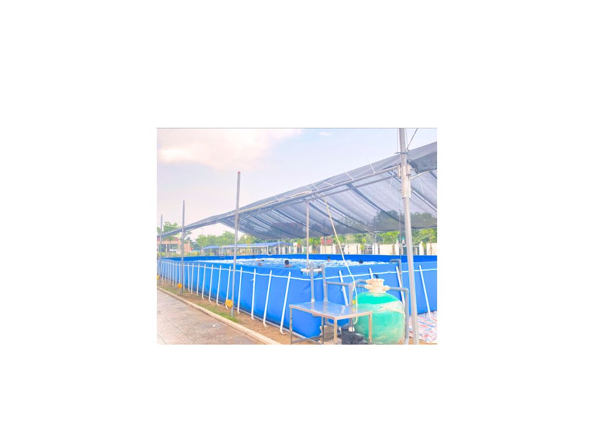 Bước 2: Chuẩn bị vật tư gồm khung kim loại, bạt PVC, hệ thống lọc nước và phụ kiện.