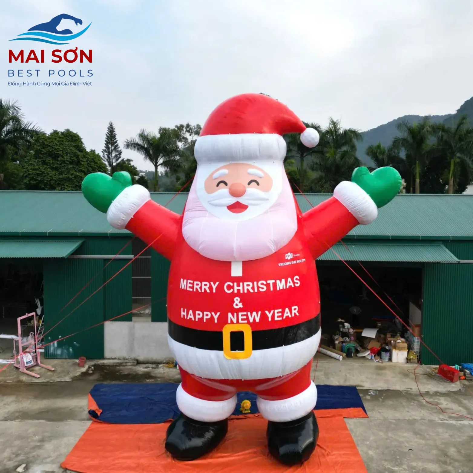 Mascot ông già Noel bơm hơi khổng lồ cao 10m là mô hình trang trí Noel cỡ lớn, được sản xuất từ chất liệu bạt PVC 5 lớp cao cấp, vận hành bằng hệ thống máy thổi liên tục giúp mascot luôn giữ form dáng ổn định. Với chiều cao lên tới 10 mét, mascot dễ dàng thu hút ánh nhìn từ khoảng cách xa, trở thành biểu tượng Giáng Sinh nổi bật trong không gian ngoài trời rộng lớn.