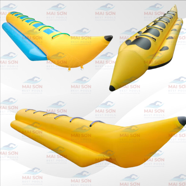 Thuyền chuối bơm hơi được thiết kế hình chuối độc đáo, kết hợp màu sắc đa dạng và bắt mắt. Đây chính là mẫu đồ chơi team building mang lại trải nghiệm vui chơi thú vị. Sản phẩm được làm từ chất liệu PVC 5 lớp dày 0.9mm, có độ bền cao, có khả năng chống thấm nước và chịu được các tác động từ môi trường. Thuyền chuối bơm hơi có kích thước phổ biến nhất là 5m, phù hợp sử dụng cho 5 người trở lên.